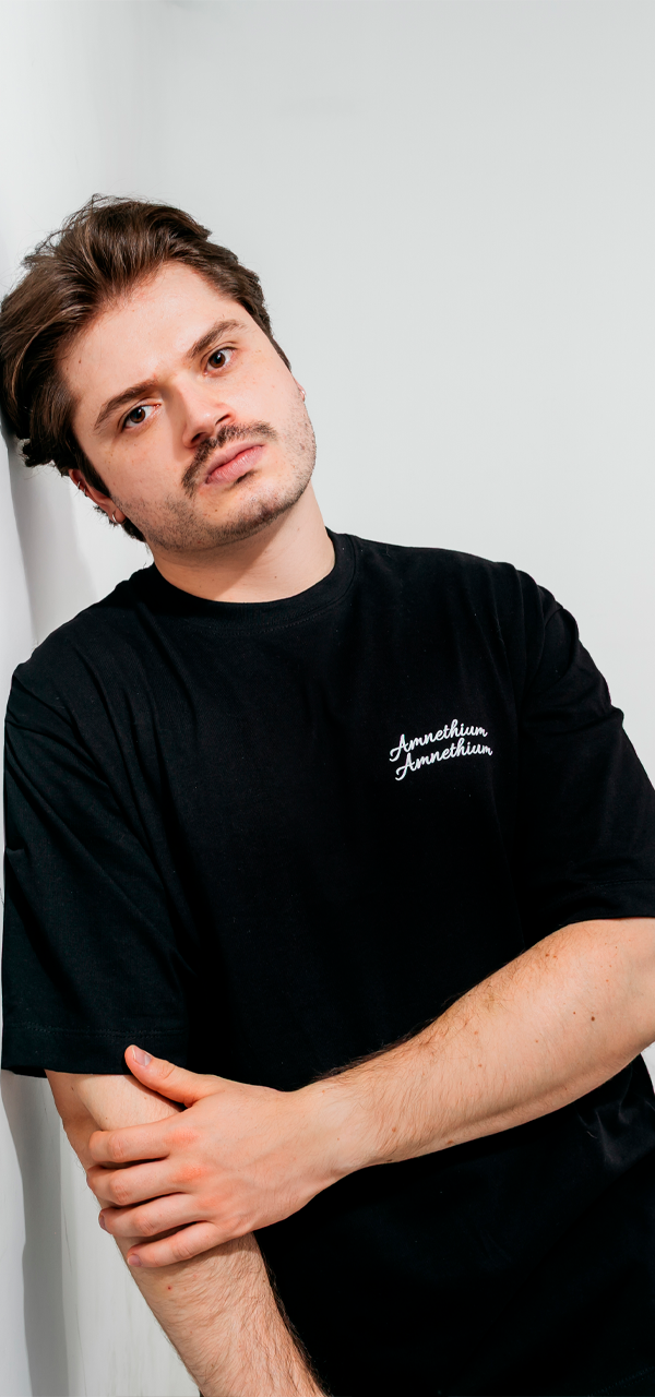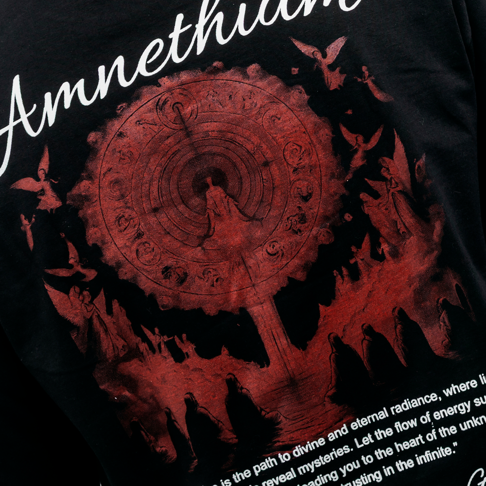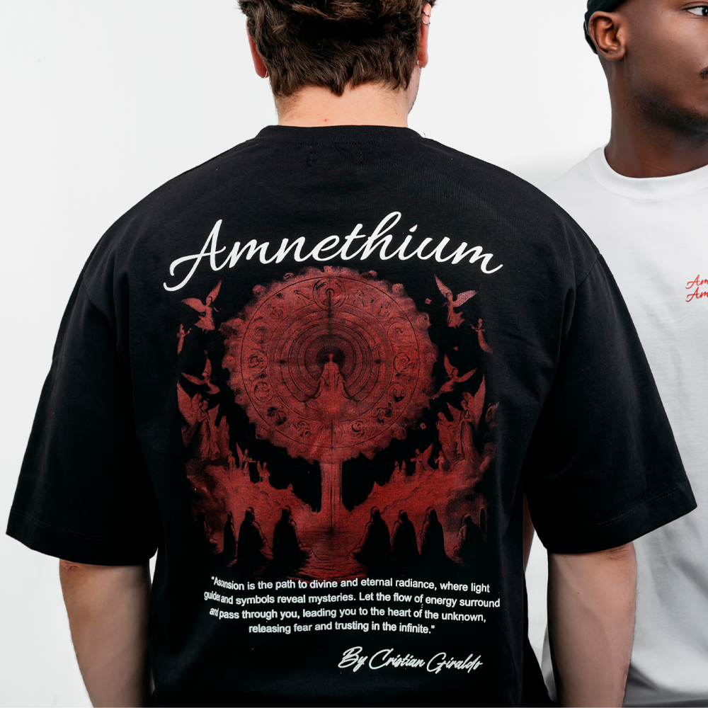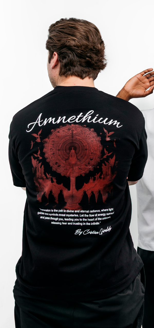 Camiseta en 100% algodón con, molde oversized tono negro y cuello en rib. Su caída recta aporta un estilo urbano y versátil. Intervenida con estampado gráfico en el frente al lado del corazón, y en el centro de la parte posterior.